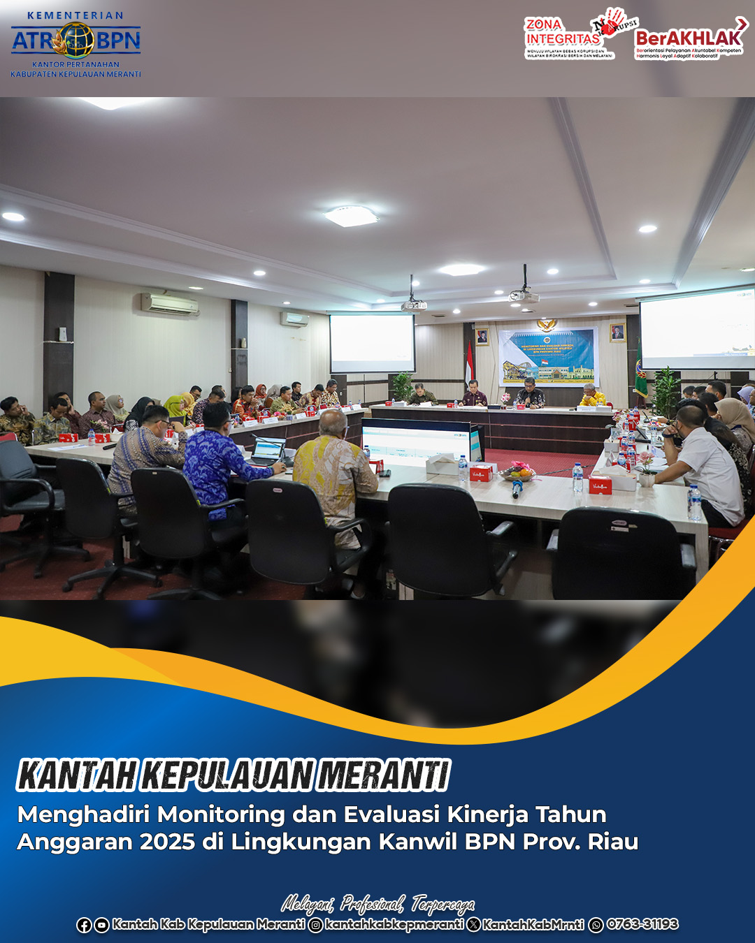 Kantor Pertanahan Kabupaten Kepulauan Meranti turut menghadiri kegiatan Monitoring dan Evaluasi (Monev) Kinerja Tahun Anggaran 2025 yang diselenggarakan oleh Kantor Wilayah BPN Provinsi Riau, Kamis (10/07).