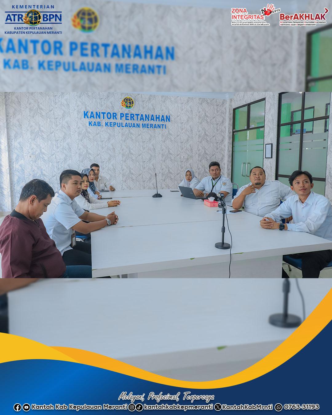 Kepulauan Meranti, 10 September 2025 – Seluruh staf dan jajaran Seksi Survei dan Pemetaan Kantor Pertanahan Kabupaten Kepulauan Meranti mengikuti Bimbingan Teknis (Bimtek) Analisis Risiko Kegiatan Pendaftaran Tanah Sistematis Lengkap (PTSL) Terintegrasi Tahun 2025. Kegiatan ini diselenggarakan oleh Direktorat Jenderal Survei dan Pemetaan Pertanahan dan Ruang Kementerian ATR/BPN secara hybrid, yaitu luring di Jakarta dan daring melalui aplikasi Zoom Meeting.