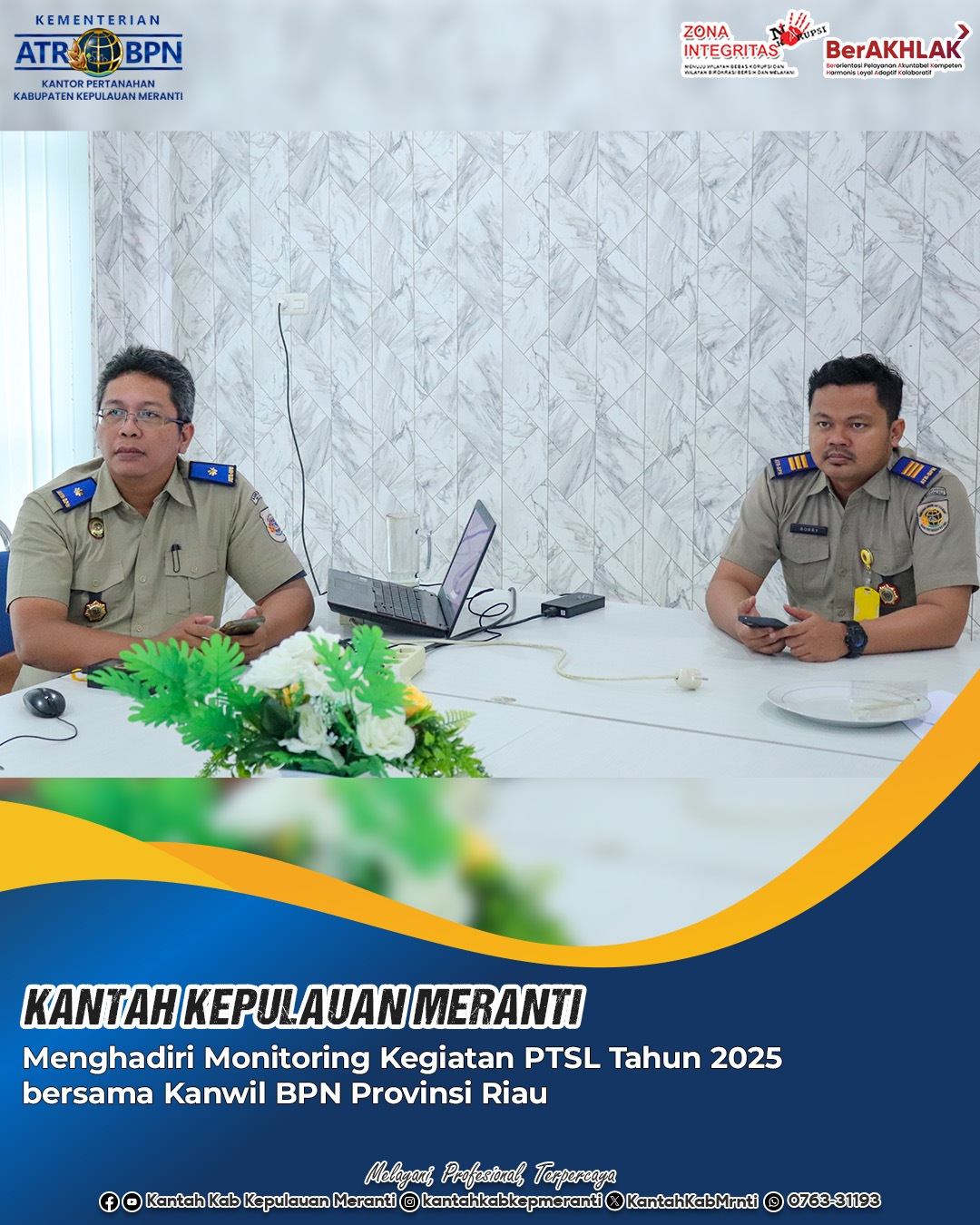 Kegiatan monitoring ini diikuti oleh Pejabat Pengawas Kantor Pertanahan Kabupaten Kepulauan Meranti. Monitoring ini menjadi bagian dari komitmen Kanwil BPN Provinsi Riau untuk mengevaluasi sekaligus mempercepat pelaksanaan program PTSL di seluruh kabupaten/kota se-Provinsi Riau. Selain membahas capaian, kegiatan ini juga menjadi wadah untuk mengidentifikasi hambatan yang dihadapi di lapangan serta langkah percepatan yang diperlukan.
