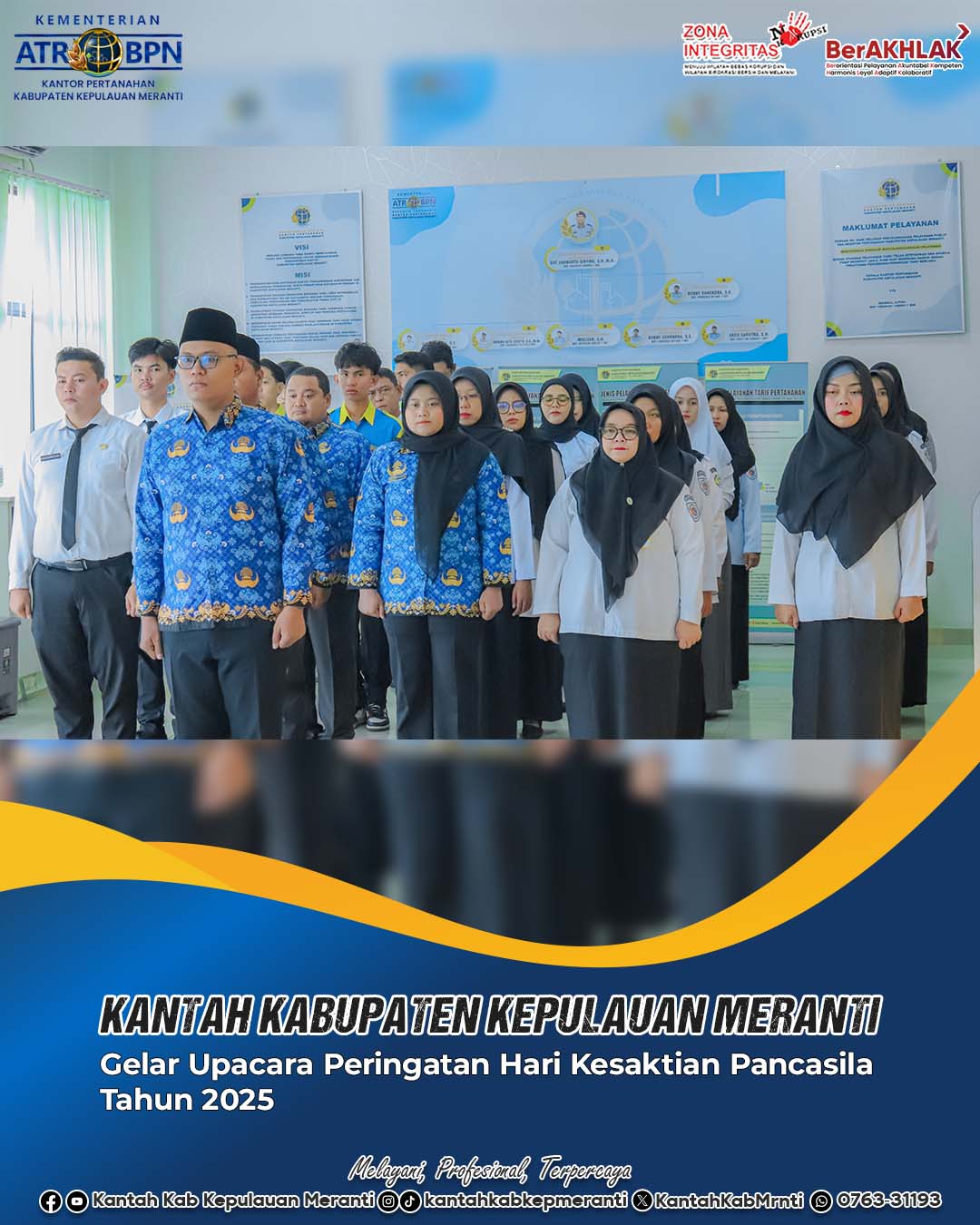 Selatpanjang – Dalam rangka memperingati Hari Kesaktian Pancasila, Kantor Pertanahan Kabupaten Kepulauan Meranti menggelar upacara pada Rabu (1/10/2025) di halaman kantor setempat. Kegiatan ini diikuti oleh seluruh jajaran, mulai dari pejabat struktural, pegawai negeri sipil, pegawai pemerintah dengan perjanjian kerja (PPPK), pegawai pemerintah non-pegawai negeri (PPNPN), hingga tenaga pendukung.
