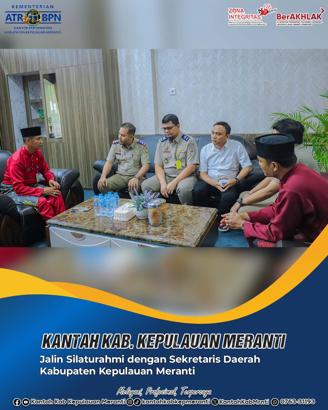 MERANTI — Kepala Kantor Pertanahan Kabupaten Kepulauan Meranti beserta jajaran melaksanakan silaturahmi dengan Sekretaris Daerah Kabupaten Kepulauan Meranti yang baru dilantik, Selasa (16/12/2025). Kegiatan ini merupakan bagian dari upaya memperkuat koordinasi dan sinergi antara instansi vertikal dan pemerintah daerah.