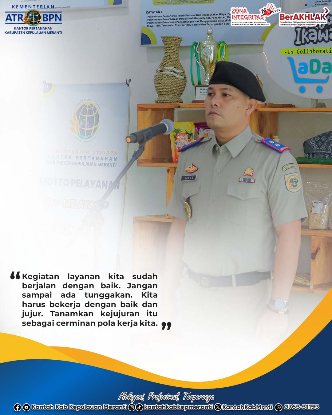 Apel pagi tersebut diharapkan dapat memperkuat komitmen seluruh jajaran Kantah Meranti untuk terus mengedepankan profesionalisme, integritas, dan kedisiplinan dalam memberikan pelayanan pertanahan kepada masyarakat.