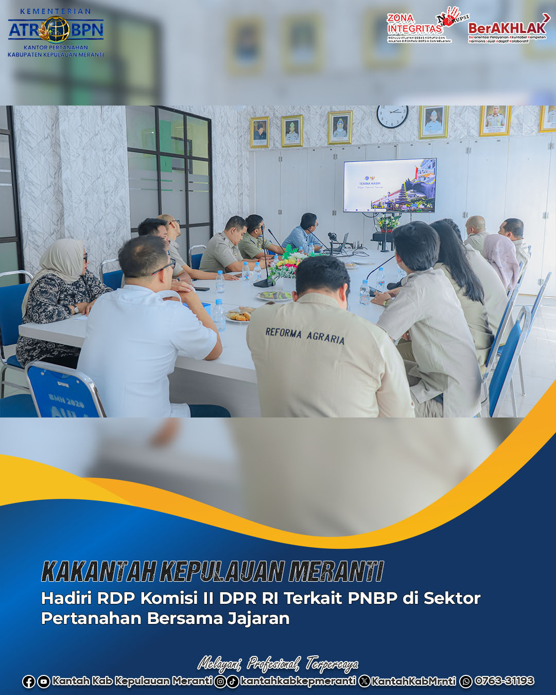 Kehadiran Kepala Kantor Pertanahan Kabupaten Kepulauan Meranti bersama jajaran dalam rapat ini merupakan bentuk dukungan terhadap transparansi dan akuntabilitas pengelolaan PNBP di bidang pertanahan. Melalui partisipasi aktif, Kantor Pertanahan diharapkan mampu menyelaraskan pelaksanaan tugas di daerah dengan kebijakan nasional, serta memastikan bahwa layanan pertanahan dapat memberikan manfaat optimal bagi masyarakat sekaligus berkontribusi nyata terhadap penerimaan negara.